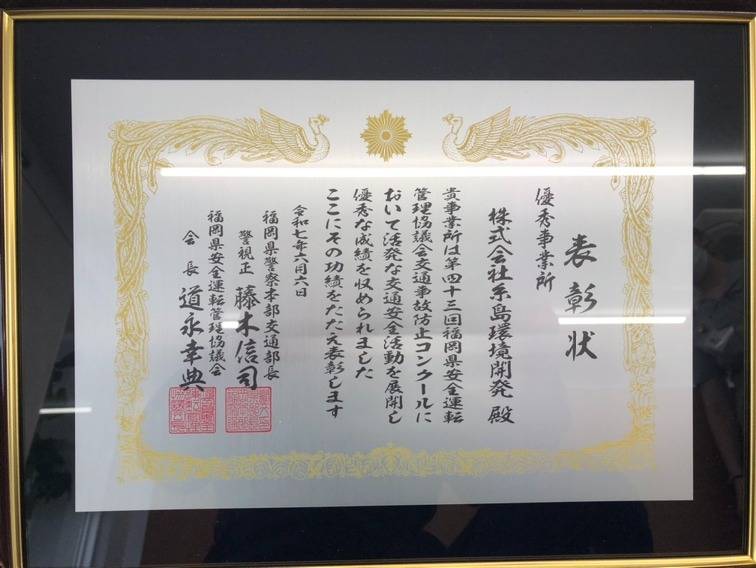 福岡県警察本部交通部長・福岡県安全運転管理者協議会長連名表彰銀賞を受賞しました🥈✨❗
