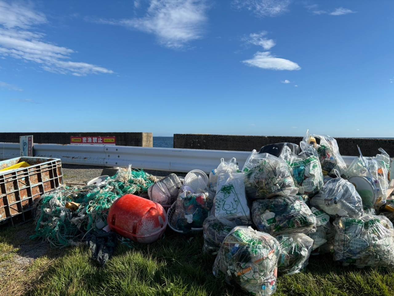海岸には、様々な場所から流れ着いたポリタンクや漁具などの大型漂着ゴミに加えて、カンやペットボトル、発泡スチロール片や細かなプラスチックごみなども多く見られました。